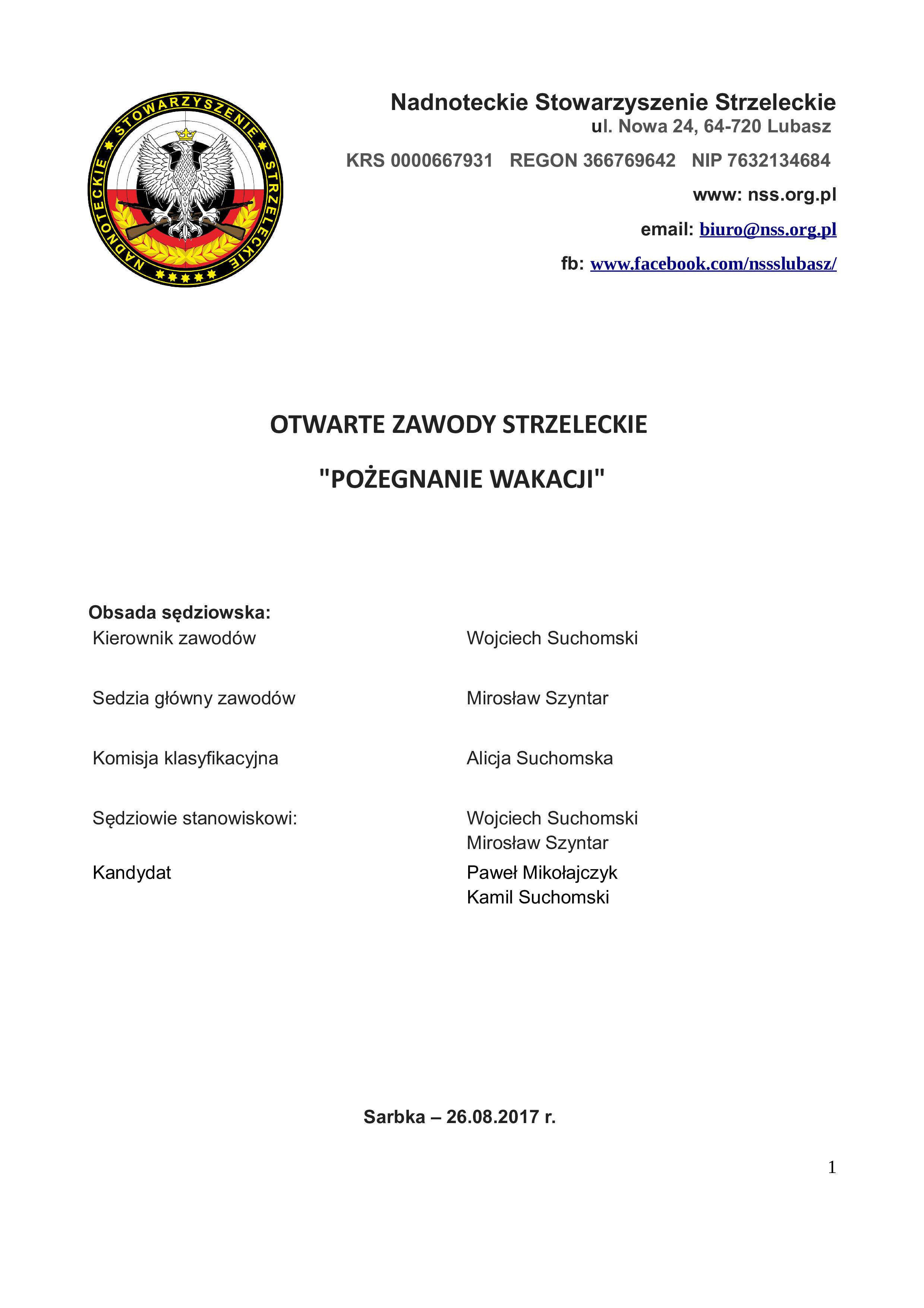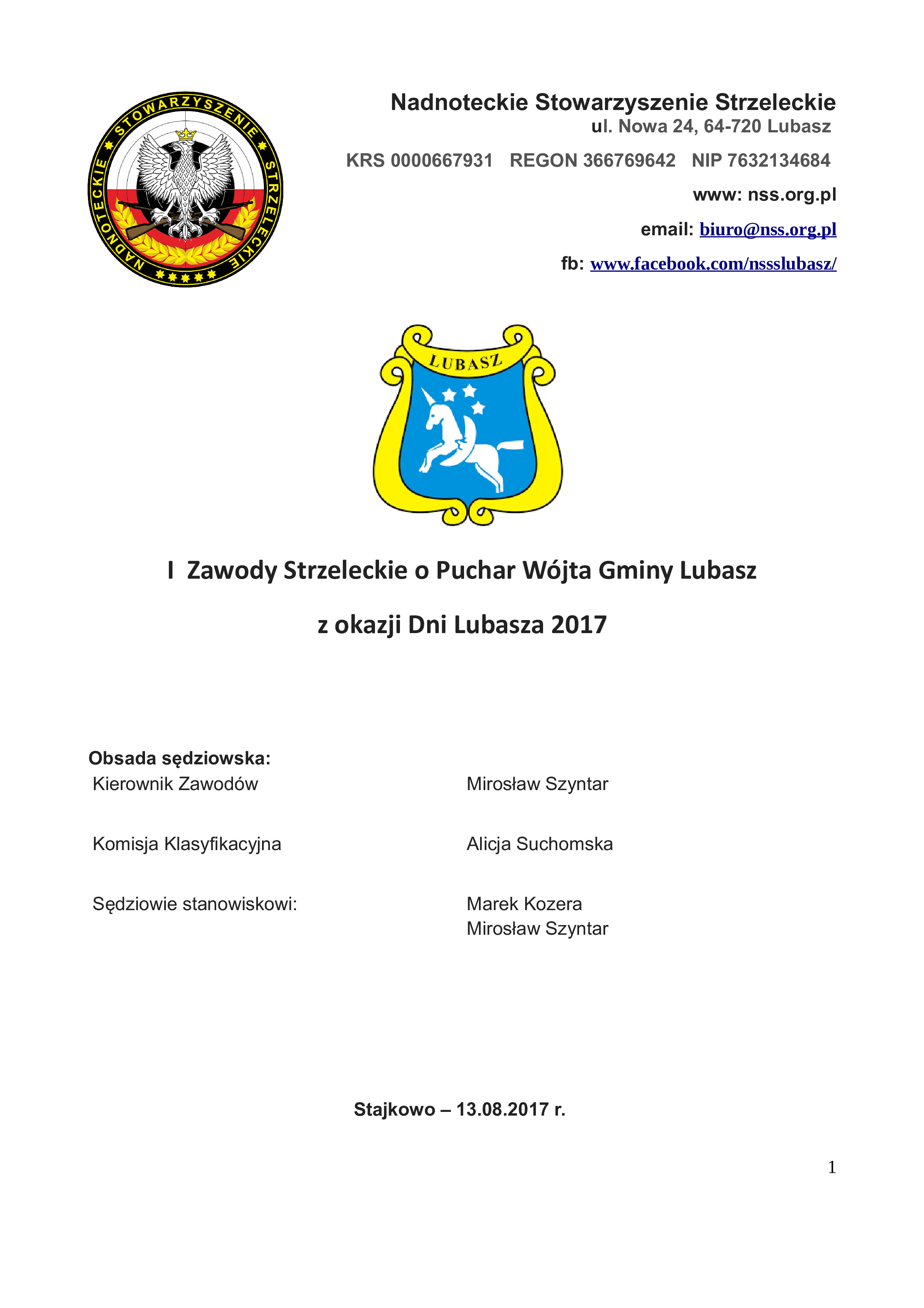 I Zawody Strzeleckie o Puchar Wójta Gminy Lubasz 13.08.2017 Nadnoteckie Stowarzyszenie Strzeleckie I Zawody Strzeleckie o Puchar Wójta Gminy Lubasz z Okazji Dni Lubasza 2017
